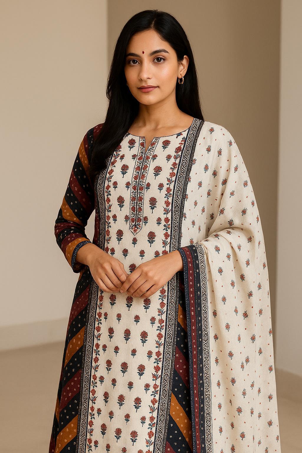 Elevate your ethnic wardrobe with this beautifully designed unstitched cotton suit material set. The top features an elegant floral print on a cream base, bordered with intricate rose motifs and fine black detailing. The multicolor striped sleeves and side panels add a vibrant contrast, offering a perfect blend of tradition and trend. Paired with a coordinated full-length cotton dupatta, this 3-piece set provides ample fabric for custom tailoring to your preferred style.