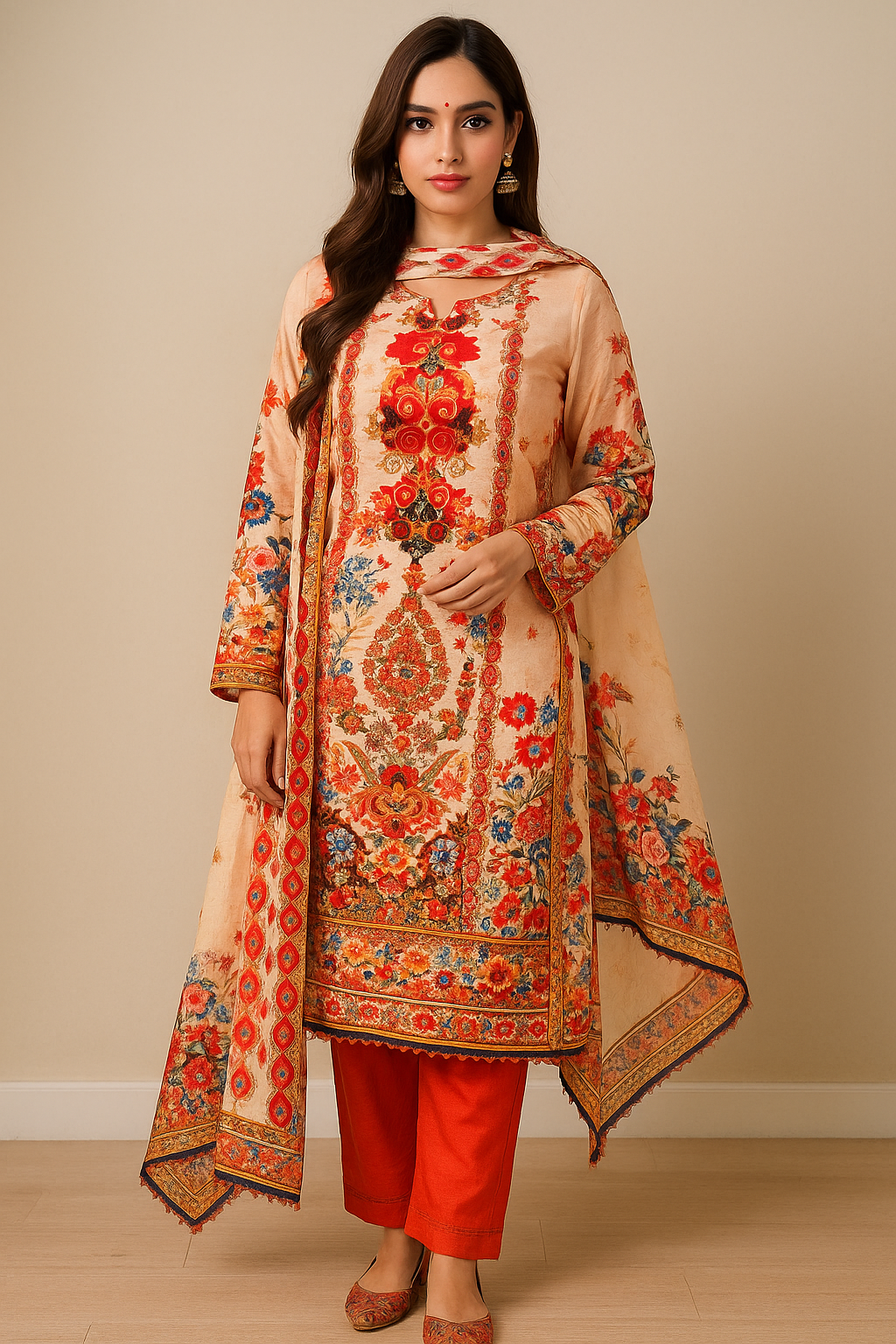Add a touch of sophistication to your wardrobe with this beautifully crafted muslin suit set featuring a vibrant, intricate print. The soft and breathable muslin top (2.5m) pairs seamlessly with a comfortable rayon bottom (2.5m), creating an effortlessly graceful silhouette. Completing the look is a full-length pure dupatta, adorned with rich, artistic designs that enhance its ethnic charm. Perfect for festive occasions, casual get-togethers, or cultural events, this ensemble blends tradition with trend in the most elegant way.