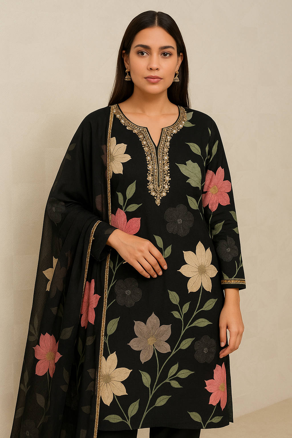Discover timeless elegance with our Floral Embroidered Rayon Unstitched Suit Material. Crafted from soft, breathable rayon, this suit set offers both style and comfort. The top features delicate floral prints in pastel shades with shimmering embroidery and sequin detailing for a graceful touch.