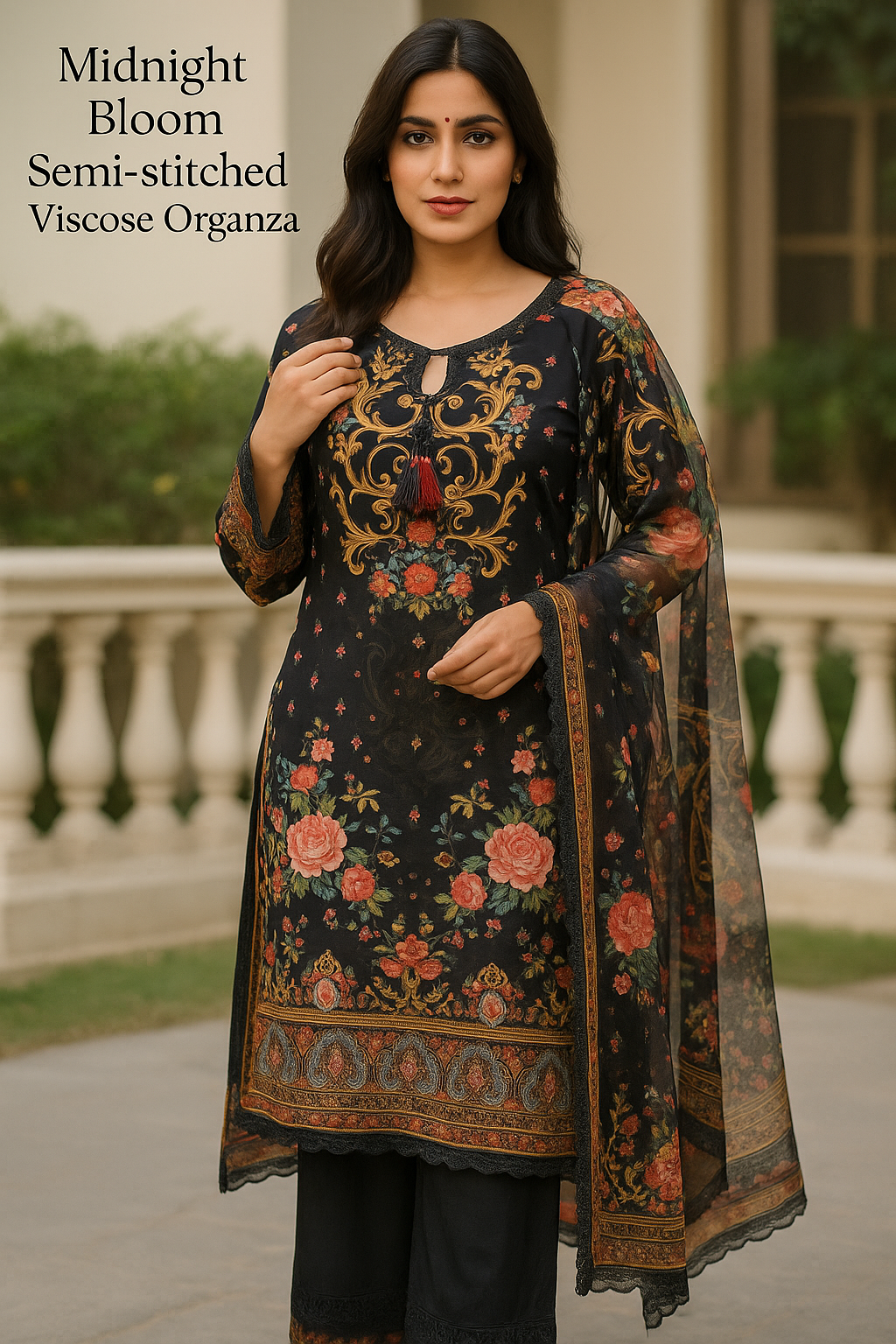 Elevate your ethnic wardrobe with the Midnight Bloom Semi-Stitched Suit, crafted in luxurious viscose organza with intricate digital floral prints. This elegant black ensemble features a 2.5-meter top, 2.5-meter rayon bottom, and a full-length organza dupatta that drapes like a dream. The semi-stitched design allows for custom tailoring, ensuring a perfect fit with a designer finish. Ideal for festive occasions, parties, and cultural gatherings, this suit is a beautiful fusion of tradition and contemporary style.