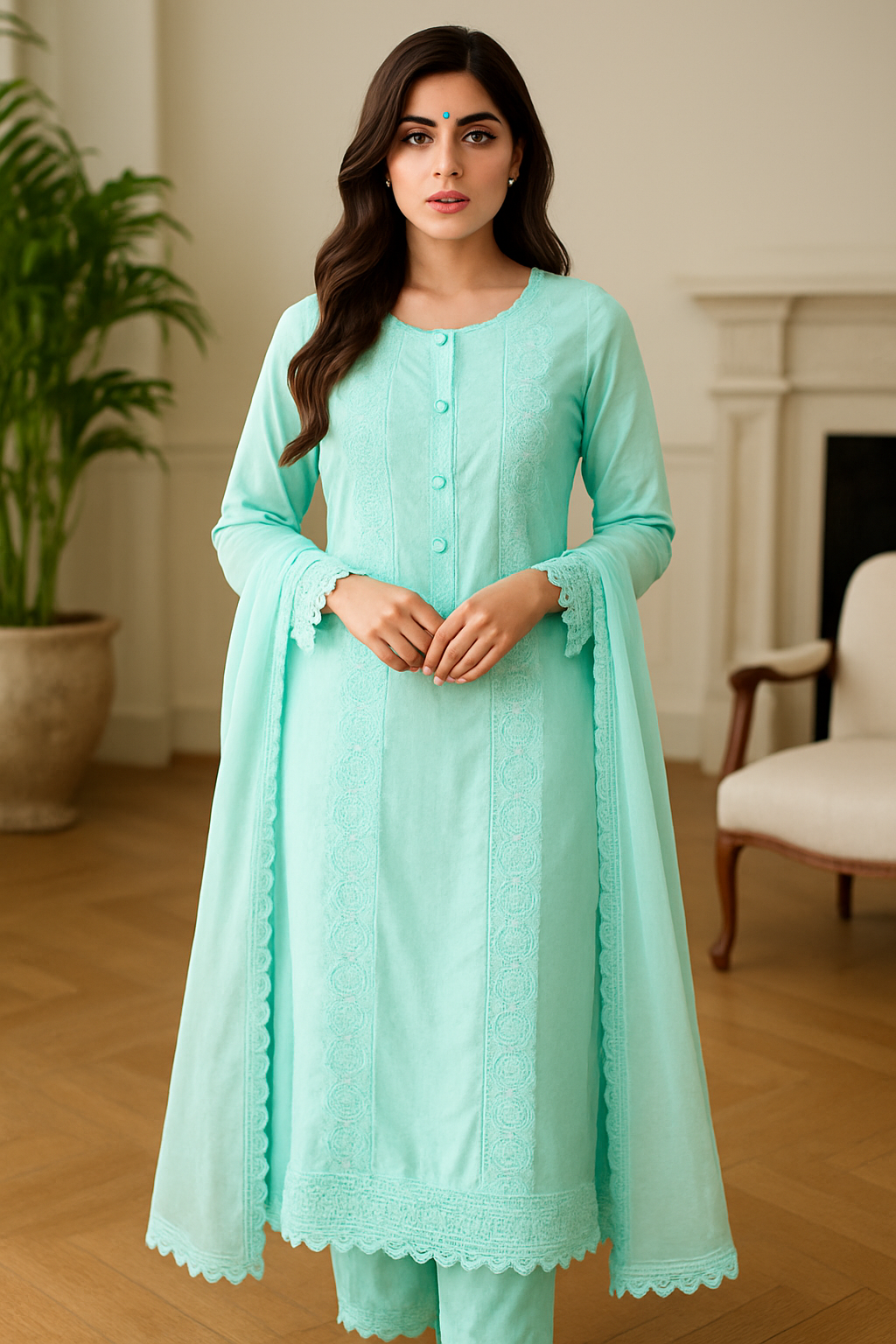 Make a graceful style statement with this elegant Pastel Silk Unstitched Suit Set. Crafted from high-quality silk fabric, this ensemble features intricate embroidery in a soft, pastel blue hue that adds a touch of sophistication to your ethnic wardrobe. The unstitched top is beautifully adorned with floral button detailing and circular thread patterns, offering both charm and versatility. The matching full-length dupatta comes with delicate lacework along the borders, completing the look with a touch of refinement.