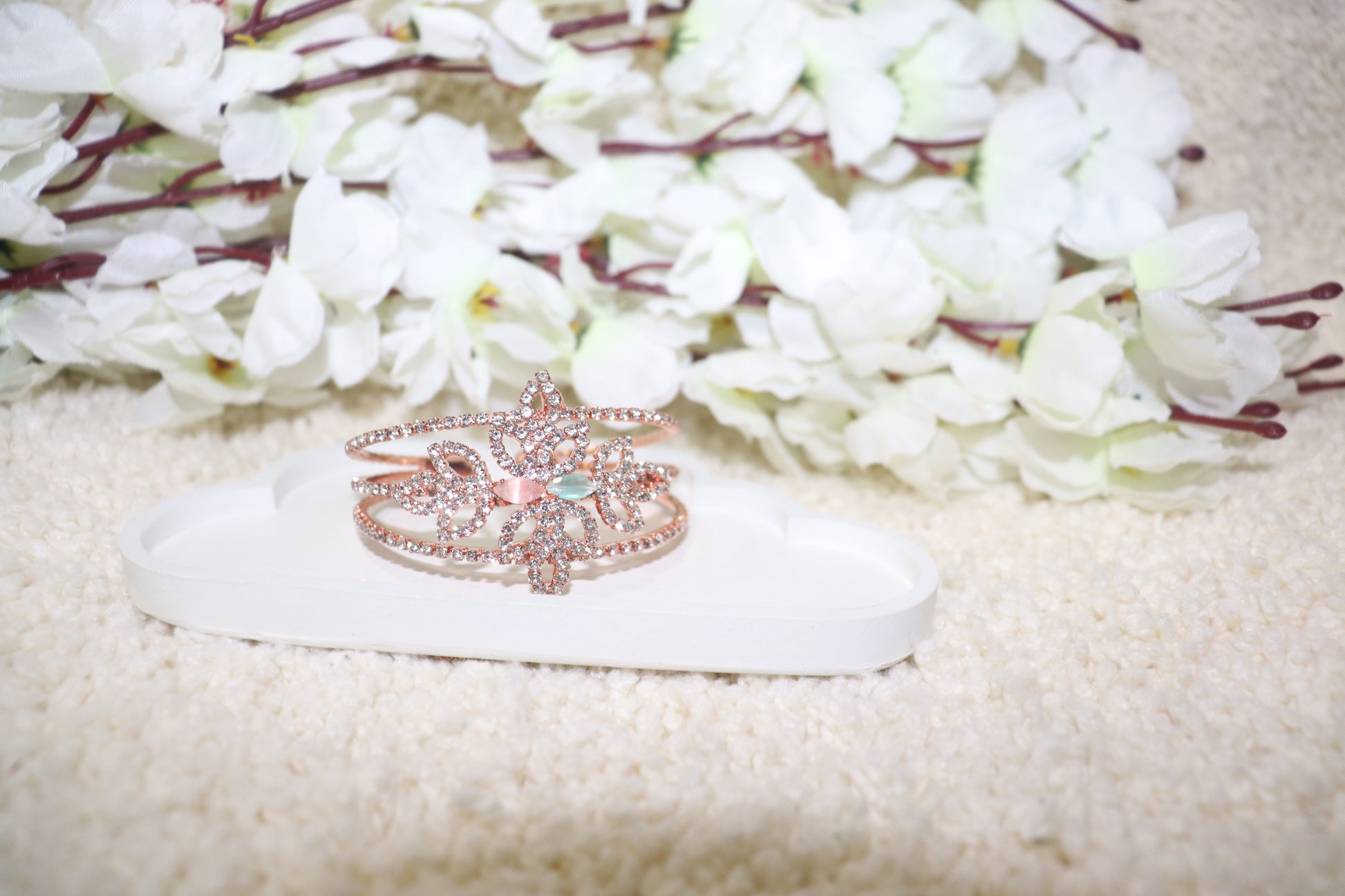 Elegant rose gold cuff bracelet with sparkling floral crystal design. Perfect for weddings, parties, or gifting. Lightweight and luxurious for everyday glam.