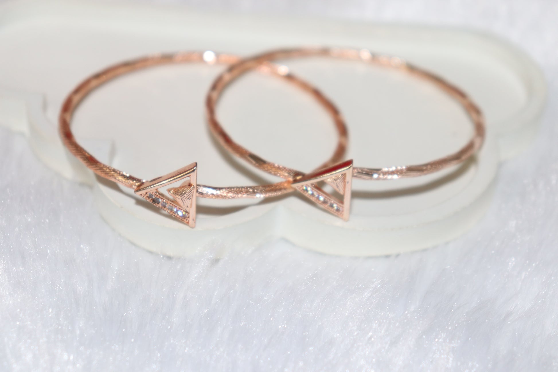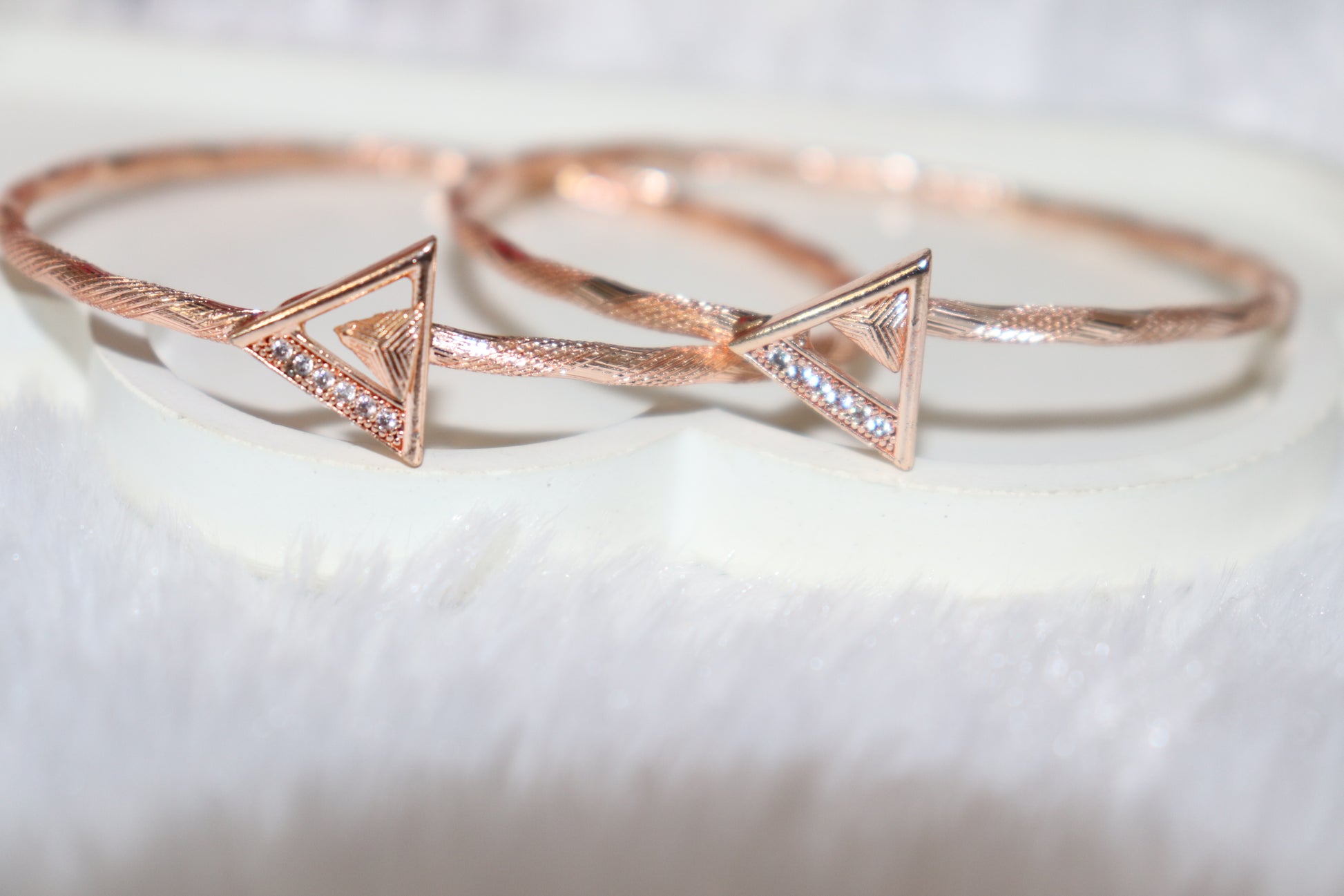 Add a contemporary twist to your jewelry collection with our Rose Gold Triangle Minimalist Bangles (Set of 2). These sleek and stylish bangles feature a unique open triangle design adorned with shimmering cubic zirconia stones, perfect for women who love elegant yet modern accessories. The soft rose gold tone adds a subtle glam, making them ideal for both casual and party wear.