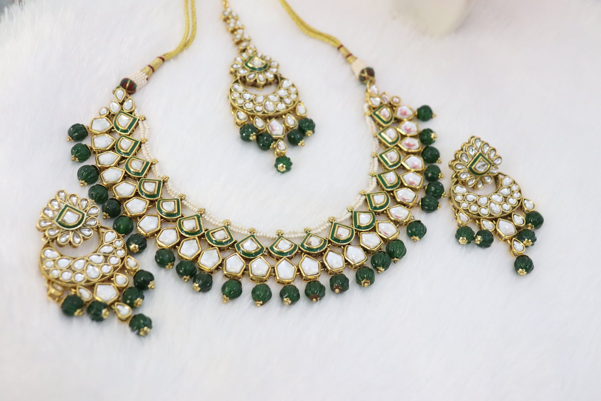 Royal Kundan & Emerald Green Beaded Necklace Set