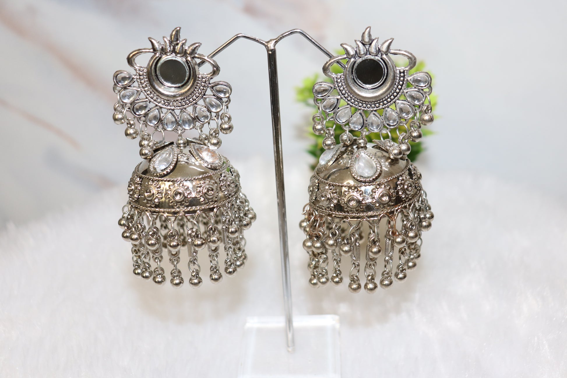 Add a touch of vintage charm to your jewelry collection with these Royal Mirror-Work Oxidized Jhumka Earrings. Designed for women who love ethnic fashion, these statement jhumkas feature intricate silver oxidized detailing, mirror embellishments, and cascading ghungroo beads for a perfect blend of elegance and tradition. Their bold yet lightweight design makes them an ideal accessory for weddings, festive occasions, or casual ethnic wear.