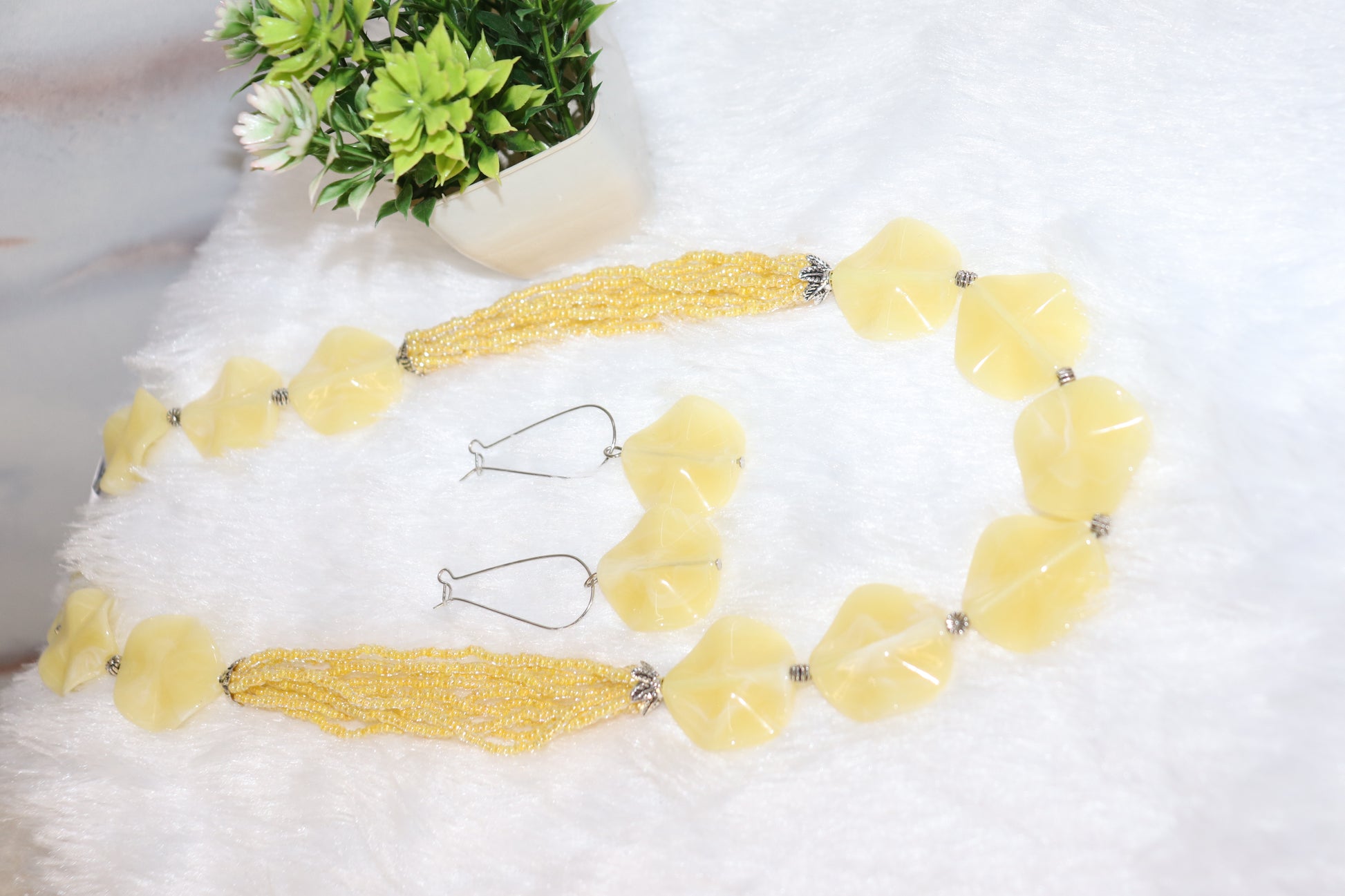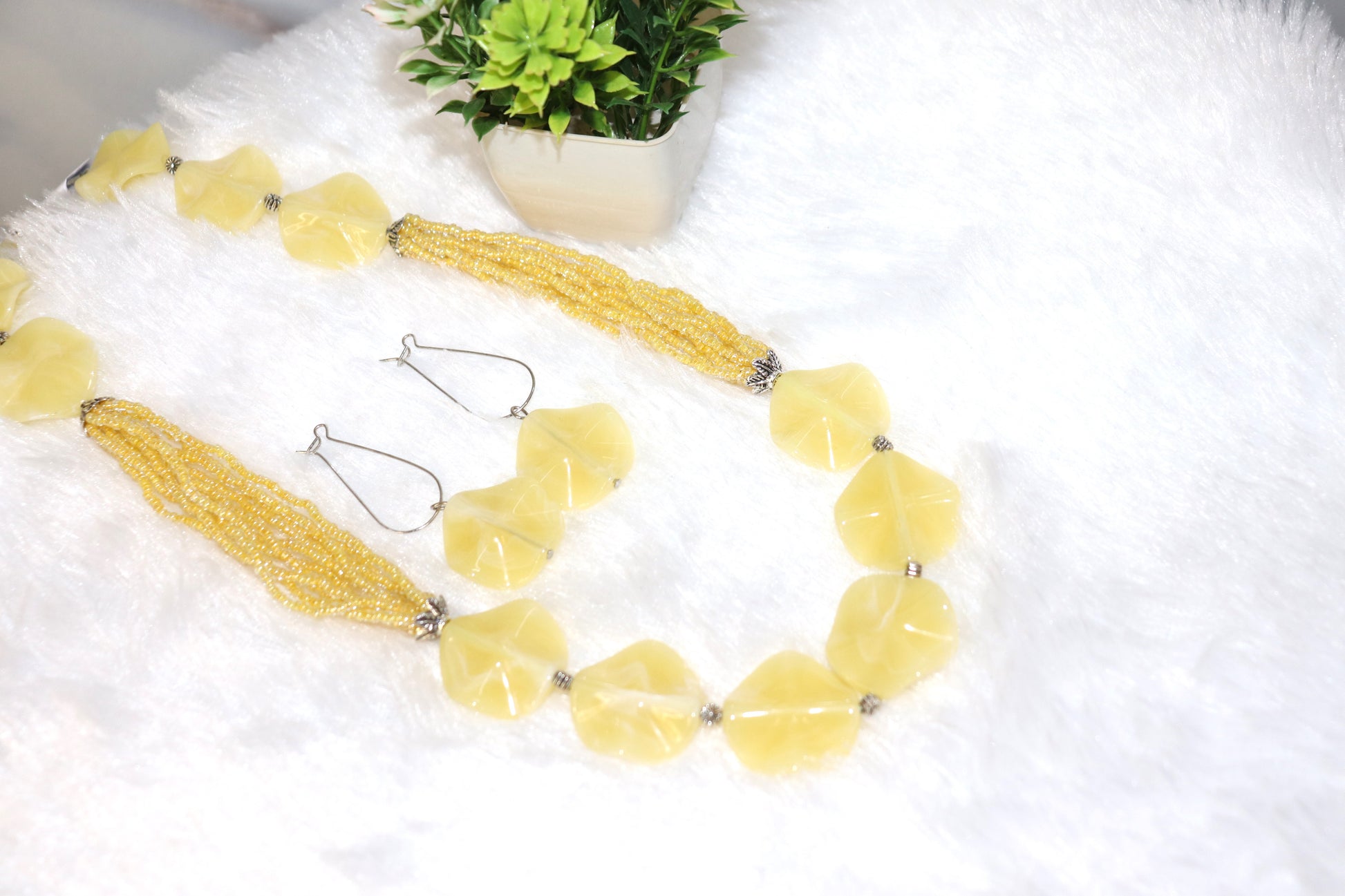 Make a bold fashion statement with our Yellow Beaded Statement Necklace Set, designed for those who love to stand out! This handcrafted necklace features chunky yellow gemstones paired with multiple strands of delicate seed beads, creating a vibrant and eye-catching look. The set comes with matching drop earrings to complete your ensemble effortlessly.